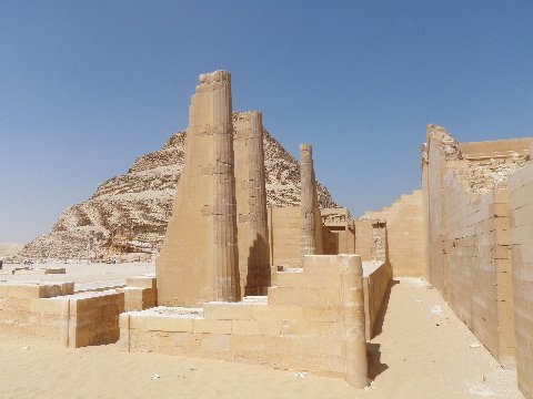 Next to the step pyramid is a remarkably well preserved temple, although many pieces have been removed to the Egyptian Museum where I saw them later. Some columns from the temple can be seen here